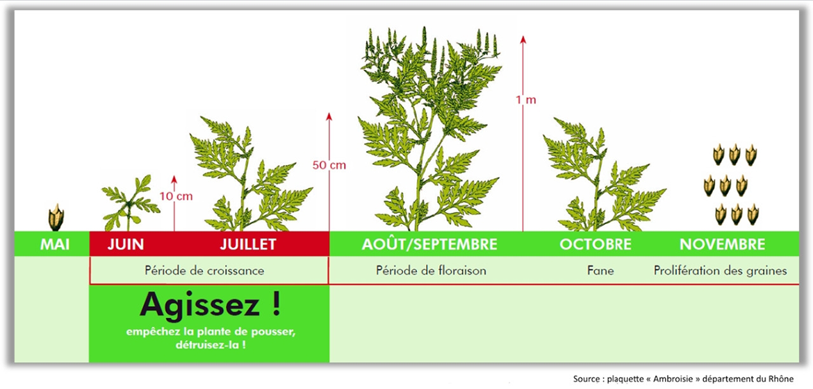 - La floraison et l’émission de pollen se font principalement d’août à octobre avec un pic en septembre (plusieurs millions de grains de pollens par pied d’ambroisie). Les fleurs mâles et femelles sont présentes sur le même pied, rendant l'autofécondation possible. Il suffit donc qu'un unique plant germe dans une zone indemne pour qu'une population d'ambroisie se mette en place.